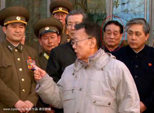 勞動黨計劃財政部長樸南基(紅圈中)可能在上周因為貨幣改革失敗而被槍決。圖片是2009年3月,金正日視察Kimilsung 大學時,樸南基陪同。