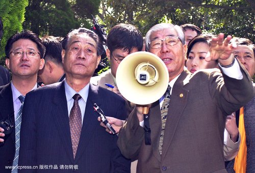 勞動黨計劃財政部長樸南基(前左)可能在上周因為貨幣改革失敗而被槍決。圖片是2002年樸南基參觀韓國最南邊的Jeju 島。