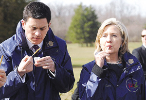 據(jù)英國媒體3月31日報道,此次的G8外長會議,各位外長們穿上了尼龍質(zhì)地的藍(lán)色滑雪衫,平常嚴(yán)謹(jǐn)有余、活潑不足的各位外長甚至還在鏡頭前“放肆地”大嚼加拿大特產(chǎn)的楓汁太妃糖。不過,最受媒體關(guān)注的還是美國國務(wù)卿希拉里和英國帥哥外交大臣米利班德。當(dāng)天,他們在鏡頭前也絲毫沒有半點(diǎn)避嫌的意思。兩人全然不顧及自己的形象,一邊嚼著太妃糖,一邊與對方有說有笑。為此,英國媒體調(diào)侃兩人為“外交伉儷”,并特意分別為兩人取名為“小!焙汀靶∶住。