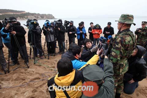 1日上午,韓國海軍陸戰(zhàn)隊大隊長在仁川甕津郡白翎島長村浦口海岸邊向記者介紹搜救工作的進展狀況。