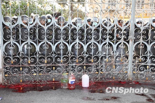 曼谷當(dāng)?shù)貢r間3月16日下午4時許,泰國紅衫軍將上午從成千上百的紅衫軍身上抽取的鮮血裝在幾十個塑料罐里,并聲勢浩大地來到曼谷總理府大門前舉行“血灑總理府”儀式。紅衫軍核心頭目納塔兀表示,自今天起將分階段對總理府、執(zhí)政民主黨總部和阿披實官邸潑灑100萬毫升基層民眾的鮮血,目的是令“內(nèi)閣官員踐踏人民鮮血”,向政府施壓迫其解散國會。圖為灑在總理府鐵門前的鮮血。 中新社發(fā) 顧時宏 攝