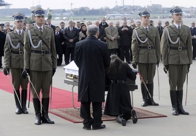 卡欽斯基的靈柩11日由一架波軍直升機(jī)從撞機(jī)地點(diǎn)俄羅斯斯摩棱斯克運(yùn)返波蘭首都華沙,代理總統(tǒng)科莫羅夫斯基、總理圖斯克等官員在場迎接,以一場簡短的宗教儀式向其致祭。靈柩將會由軍隊護(hù)送到總統(tǒng)府,稍后,當(dāng)局將會把總統(tǒng)府開放,讓民眾進(jìn)入瞻仰卡欽斯基的遺容。