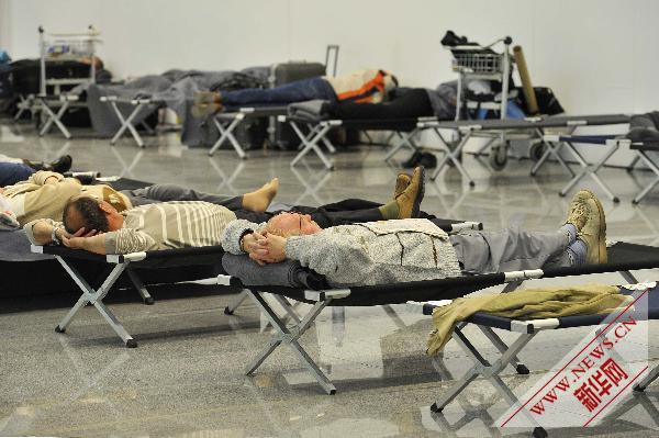 4月16日,在比利時首都布魯塞爾國際機場,因航班取消而滯留機場的旅客在臨時休息區(qū)休息。新華社記者武巍攝
