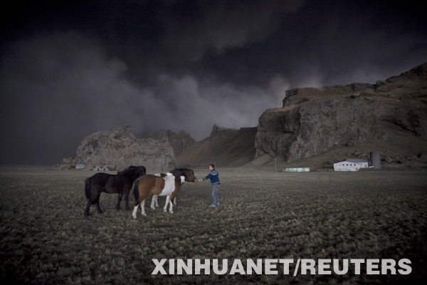 4月17日,在冰島一處農(nóng)場(chǎng),農(nóng)夫索拉林·奧拉夫松試圖安撫他的馬匹免受夾雜火山灰的烏云驚擾。冰島南部火山日前再次噴發(fā)所產(chǎn)生的大量火山煙塵嚴(yán)重影響了歐洲地區(qū)的空中交通,導(dǎo)致多個(gè)國(guó)家機(jī)場(chǎng)關(guān)閉,大量航班被取消。新華社/路透