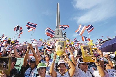 黃衫軍示威者聚集在曼谷英雄紀(jì)念碑,揮國旗及泰王海報(bào)。