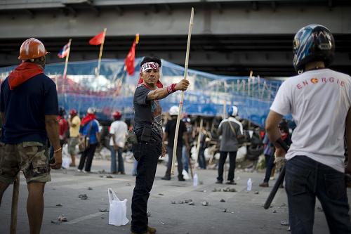 4月26日,一名“紅衫軍”成員手握削尖的竹竿站在泰國(guó)首都曼谷“紅衫軍”的營(yíng)地里。泰國(guó)部分府的反政府“紅衫軍”當(dāng)天采取行動(dòng),阻止警察進(jìn)入曼谷參加政府計(jì)劃驅(qū)散“紅衫軍”集會(huì)示威者的行動(dòng)。新華社/法新