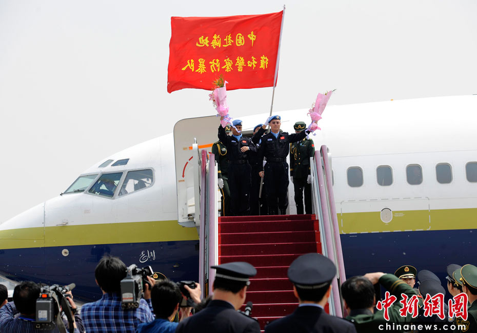5月4日,中國第八支赴海地維和警察防暴隊全體隊員乘坐聯(lián)合國包機返回祖國。公安部副部長孟宏偉、政治部主任蔡安季前往機場迎接。 中新社發(fā) 劉震 攝