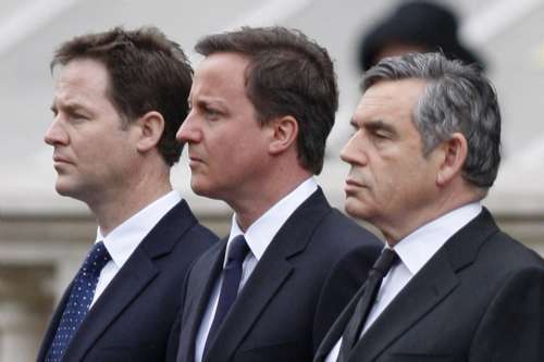 自民黨黨魁克萊格(左)、保守黨黨魁卡梅倫(中)及英國首相布朗三人正在為組閣問題而博弈。(資料圖)