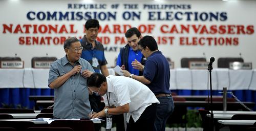 5月11日,在菲律賓首都馬尼拉,選舉委員會主席何塞·梅洛(前左)準備召開新聞發(fā)布會。菲選舉委員會當日凌晨公布的總統(tǒng)選舉投票最新統(tǒng)計結(jié)果顯示,阿基諾三世獲得1192萬張選票,比排名第二的前總統(tǒng)埃斯特拉達得票高出438萬票,阿基諾三世獲勝已成定局。新華社/法新