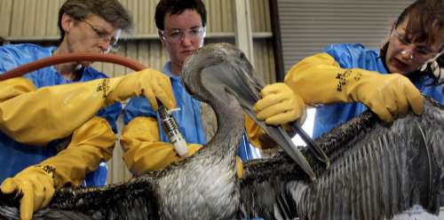 洛杉磯一間野生動物康復(fù)中心的工作人員正在清洗從墨西哥灣漏油區(qū)拯救上來的褐鵜鶘。