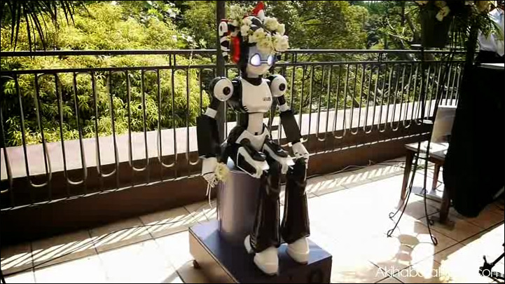 16日在東京日比谷公園,一對日本新人在機器人牧師i-Fairy的見證下舉行結婚典禮,i-Fairy原本在博物館和會展中心引導游客,這次的新任務對它來說是個新挑戰(zhàn)。工程師表示,他給i-Fairy戴上花環(huán)并輸入牧師程序,讓它可以完成對這對新人的證婚儀式,據(jù)悉完成這一活動只需要100V直流電流來讓i-Fairy保持直立和做動作。
