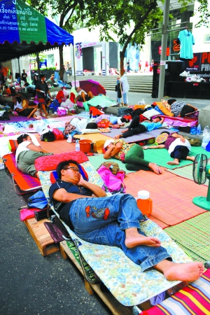 18日,在泰國首都曼谷,“紅衫軍”成員在聚集區(qū)午休。