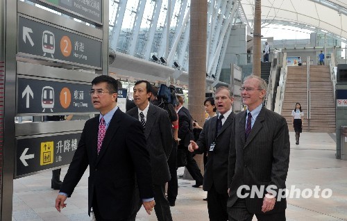 5月17日,美國商務部部長駱家輝一行,從欣澳站登車乘坐香港鐵路東涌線至香港站,體驗港鐵。駱家輝率領的美國貿(mào)易代表團是16日抵達香港,開始其訪問中國的行程。 中新社發(fā) 鄭祚聲 攝
