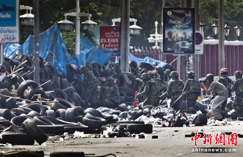 據(jù)報道,泰國軍方的裝甲車突破了一處紅衫軍示威地點(diǎn)的路障,進(jìn)入示威者大本營,軍方向示威者發(fā)射催淚瓦斯及開槍,還出動至少2架直升機(jī)協(xié)助驅(qū)散行動。另外,軍隊(duì)設(shè)立檢查站封鎖了一些路段,禁止車輛通行。
