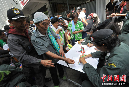 5月20日,數(shù)千名結(jié)束集會(huì)的外地“紅衫軍”示威者在曼谷拉差巴頌地區(qū)接受登記和安全檢查后,乘坐政府安排的車(chē)輛返回家鄉(xiāng)。