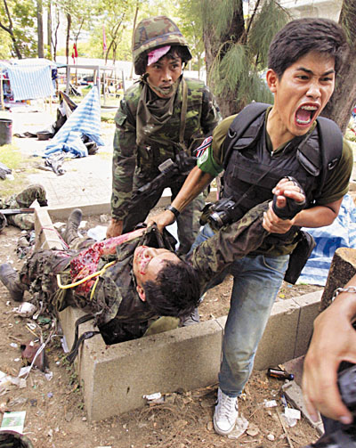 據(jù)香港《文匯報(bào)》報(bào)道,泰國(guó)軍方清場(chǎng)與紅衫軍激戰(zhàn),曼谷慘成戰(zhàn)場(chǎng),國(guó)際人權(quán)組織“人權(quán)觀察”20日指摘雙方嚴(yán)重侵犯人權(quán),批評(píng)紅衫軍射殺記者,又以兒童作為人盾,行徑應(yīng)遭譴責(zé)。