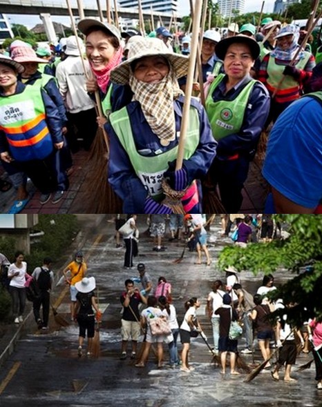 在網(wǎng)上發(fā)起年輕人前來清洗的一名前航空公司官員說,“在危機面前,我沒法坐視不管。我上網(wǎng)發(fā)信息,邀約大家來清掃街道”!拔覜Q定每周末都出去清理曼谷市容,直到曼谷恢復(fù)原樣”。