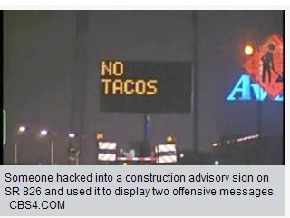邁阿密一條公路的電子廣告牌遭黑客入侵,出現(xiàn)“不要玉米餅”(NO TACOS)的字樣。