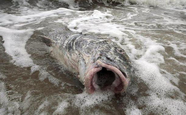 2010年5月2日,美國,帕司克里斯全:海灘上一條死去的魚。