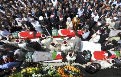 據(jù)英國廣播公司報(bào)道,在土耳其最大城市伊斯坦布爾,數(shù)千人參加了在以色列武力攔截加沙救援船隊(duì)時(shí)喪生的九名活動人士的葬禮。