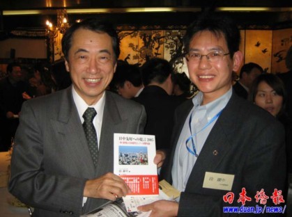 日本湖南人會(huì)會(huì)長段躍中回憶了向菅直人贈(zèng)送中國人日語作文大賽獲獎(jiǎng)作品集《對(duì)日中友好的建議》及幾次和菅直人交流的故事。段躍中指出,這次菅直人當(dāng)選新的日本首相,對(duì)中日關(guān)系會(huì)起到良好的促進(jìn)作用,期待菅直人更加發(fā)揮中國留學(xué)生的作用,開創(chuàng)中日交流的新局面。