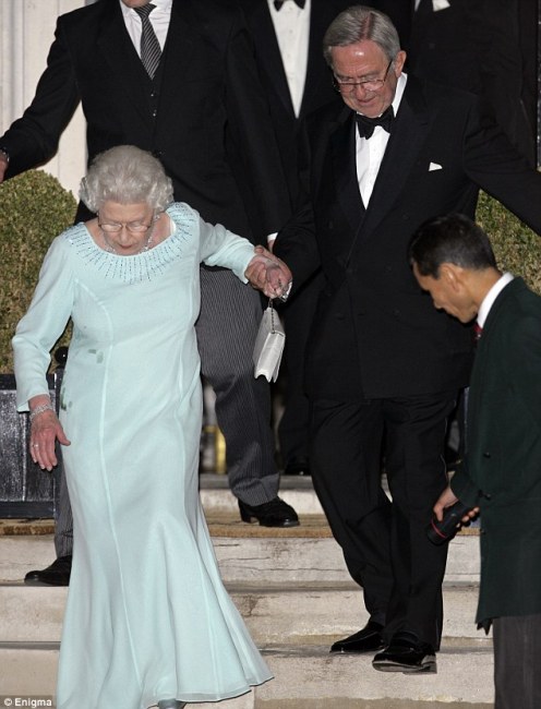 聚會(huì)結(jié)束后,在康斯坦丁國王的幫助下,已經(jīng)84歲的女王走下樓梯離開。