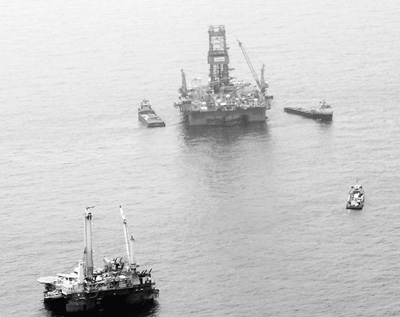 從美國(guó)海岸警衛(wèi)隊(duì)的“海洋哨兵”巡邏機(jī)尾艙往下看,墨西哥灣大片大片的浮油隨著波浪起伏,在陽(yáng)光下折射出奇異的色彩。一艘艘船只拖著浮標(biāo)在搜集海面油污。飛臨漏油“原點(diǎn)”海面,可以看到一個(gè)巨大的海上作業(yè)平臺(tái),它仍在抽取水下漏油。(見(jiàn)上圖,本報(bào)記者管克江攝)