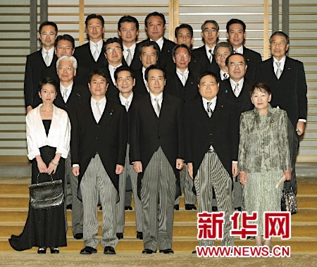 6月8日晚,日本天皇在天皇宮中舉行儀式,任命菅直人擔任日本新首相,同時一一任命了其它17名大臣。圖為菅直人率閣員合影。