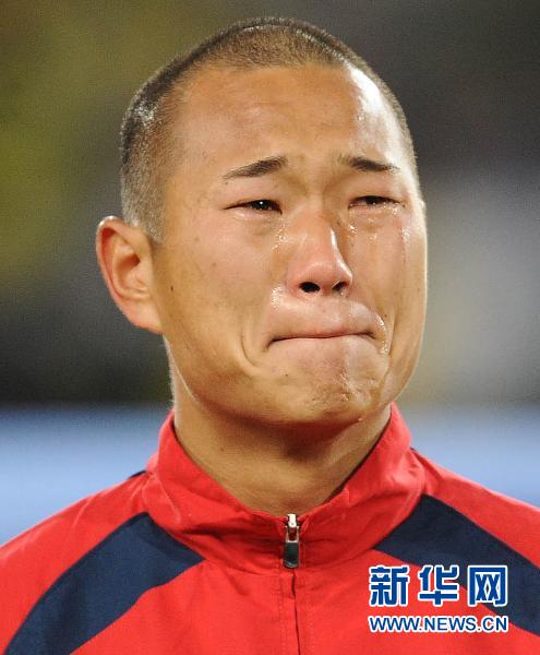 6月15日,朝鮮隊球員鄭大世在奏朝鮮國歌時淚流滿面。當(dāng)日,在2010南非世界杯小組賽G組比賽中,朝鮮隊對陣巴西隊。 新華社記者李尕攝