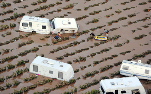 在擁有4萬(wàn)人口的德拉吉尼昂,暴雨導(dǎo)致泥水淹沒(méi)該城鎮(zhèn),造成11人死亡。許多車(chē)子被洪水沖走,疊成一堆,不少渡假屋和營(yíng)地則被洪水破壞。