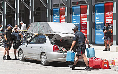 據(jù)香港《文匯報(bào)》26日?qǐng)?bào)道,G20峰會(huì)前夕,各成員國(guó)領(lǐng)袖陸續(xù)抵?,加拿大警方在多倫多市采取極嚴(yán)密保安措施。連日來(lái)已有3名可疑人士被捕,其中1名53歲男子前日駕車(chē)經(jīng)過(guò)峰會(huì)會(huì)場(chǎng)禁區(qū),由于車(chē)頂綁著1個(gè)鋼制儲(chǔ)物箱,模樣怪異,引起警方注意。警察攔車(chē)檢查,赫然發(fā)現(xiàn)車(chē)上有十字弓、電鋸、棒球棍、大錘外,還有多種不明液體。警方?jīng)]收這批物品,并將他拘捕。