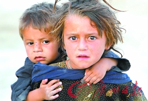 6月27日,一位阿富汗小女孩背著自己的弟弟,眼中充滿了迷茫。
