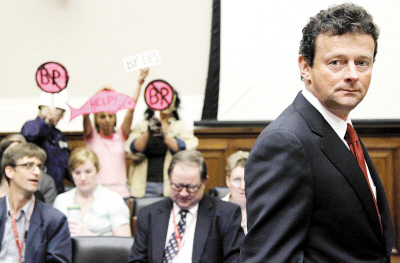 資料圖片:6月17日,英國石油公司首席執(zhí)行官托尼·海沃德(右)在出席美國國會聽證會時遭遇抗議。(圖片來源:人民網(wǎng)-環(huán)球時報)