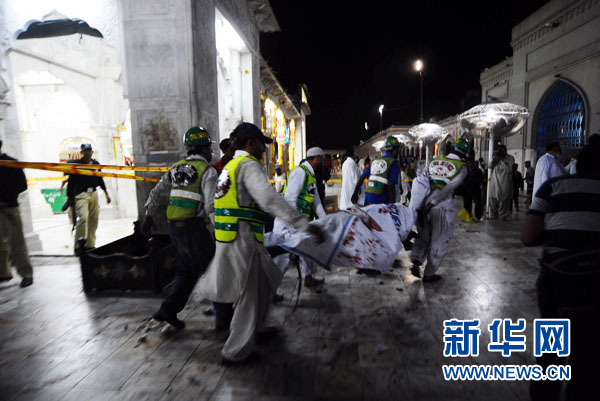 7月2日,在巴基斯坦東部城市拉合爾,救援人員從發(fā)生爆炸的圣殿內(nèi)抬出一具尸體。新華社/法新