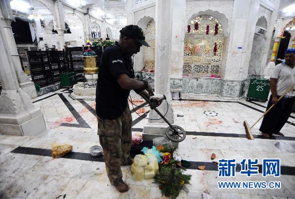 資料圖:2010年7月2日 巴基斯坦東部一座圣殿連遭三起自殺式炸彈襲擊 7月2日,一名拆彈專家在巴基斯坦東部城市拉合爾發(fā)生爆炸的地點用探測器查找爆炸物。據(jù)當?shù)鼐较,拉合爾一座圣?日深夜連續(xù)遭到三次自殺式炸彈襲擊,截至目前已造成至少37人死亡,170多人受傷。傷者已被送往附近醫(yī)院接受救治。新華社/法新