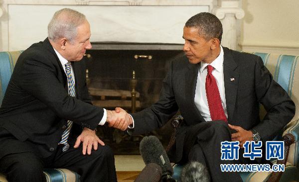 7月6日,美國(guó)總統(tǒng)奧巴馬(右)在華盛頓白宮會(huì)見(jiàn)到訪的以色列總理內(nèi)塔尼亞胡。 新華社/法新