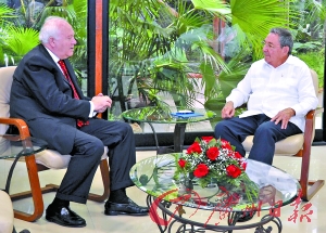 7日,古巴領(lǐng)導人勞爾·卡斯特羅(右)與到訪的西班牙外長莫拉蒂諾舉行會談。