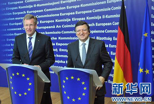 7月8日,在比利時首都布魯塞爾,德國新任總統(tǒng)武爾夫(左)與歐盟委員會主席巴羅佐舉行會談后一同出席新聞發(fā)布會。新華社記者武巍攝