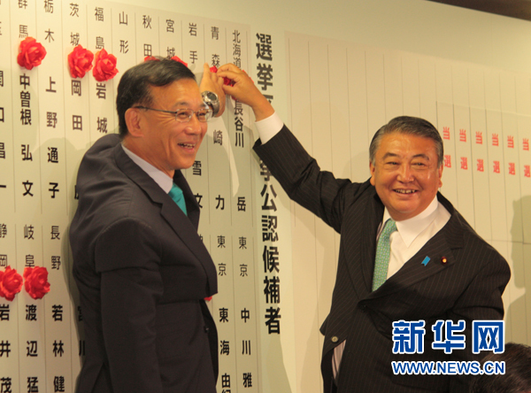 7月11日,在日本首都東京自民黨競(jìng)選總部,自民黨總裁谷垣禎一(左)和干事長(zhǎng)大島理森向本黨已當(dāng)選的參議院議員名單上貼紅花。新華社記者劉華攝