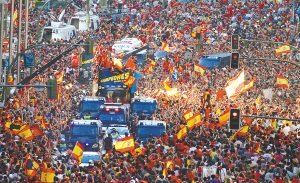 在主裁判韋伯吹響決賽結(jié)束哨后,西班牙國內(nèi)也陷入了一片狂歡之中。數(shù)十萬人在馬德里、巴塞羅那等城市慶祝斗牛士捧得大力神杯。但所謂樂極生悲,在慶祝的人群中也發(fā)生了很多不幸的事情。