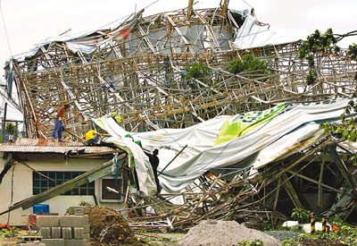 “康森”吹襲菲律賓期間,一個廣告牌倒塌,現(xiàn)場一片狼藉。