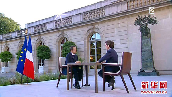 7月12日,法國總統(tǒng)薩科齊(左)在巴黎愛麗舍宮就政治獻(xiàn)金丑聞和政府改組接受法國電視二臺的專訪(電視截圖)。