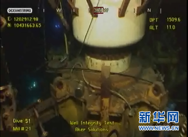 7月15日,監(jiān)控墨西哥灣海底漏油油井的攝像頭拍攝的視頻截圖顯示,漏油油井裝上新的控油裝置后再無原油漏出的跡象。在墨西哥灣漏油事件發(fā)生近3個月后,英國石油公司15日宣布,新的控油裝置已成功罩住水下漏油點,“再無原油流入墨西哥灣”。新華社發(fā)