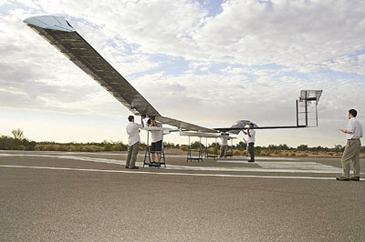Zephyr由太陽(yáng)能驅(qū)動(dòng),機(jī)翼上鋪滿紙張般薄的太陽(yáng)能電池板,其鋰硫電池在日間儲(chǔ)存能量,使飛機(jī)足夠日夜飛行,成為史上首架能源自足的飛機(jī),而且不會(huì)造成污染。Zephyr翼展長(zhǎng)22.5米,恍如史前巨鳥,機(jī)身用超輕碳纖維制造,僅重50公斤。創(chuàng)新的T字形機(jī)尾,按照空氣動(dòng)力學(xué)的原理設(shè)計(jì),可減輕空氣阻力。
