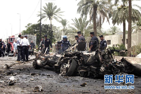 6月20日,在伊拉克首都巴格達(dá),警察在爆炸現(xiàn)場(chǎng)查看。伊拉克官員20日說,首都巴格達(dá)當(dāng)天發(fā)生兩起汽車炸彈爆炸襲擊。新華社/法新
