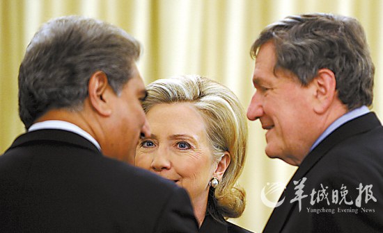 希拉里·克林頓18日在伊斯蘭堡與美國阿富汗和巴基斯坦問題特使理查德·霍爾布魯克(右)和巴外長庫雷希(左)交談