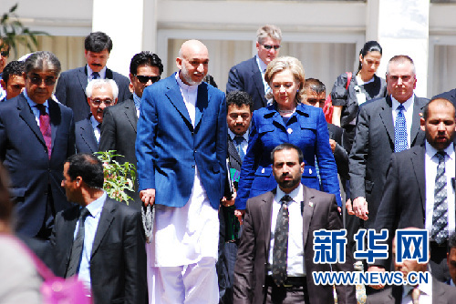 7月20日,在阿富汗首都喀布爾,阿富汗總統(tǒng)卡爾扎伊(中左)和美國國務(wù)卿希拉里·克林頓(中右)出席阿富汗問題國際會議開幕式。新華社發(fā)(薩羅什攝)