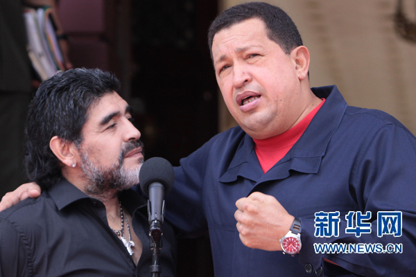 7月22日,在委內(nèi)瑞拉首都加拉加斯總統(tǒng)府,委內(nèi)瑞拉總統(tǒng)查韋斯(右)與阿根廷國家足球隊主教練馬拉多納會面。新華社發(fā)