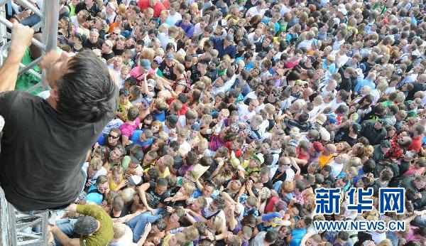 7月24日,在德國西部杜伊斯堡,人們試圖爬上欄桿躲避擁擠。當(dāng)日,杜伊斯堡舉行“愛的大游行”電子音樂狂歡節(jié)時發(fā)生踩踏事件。新華社/法新