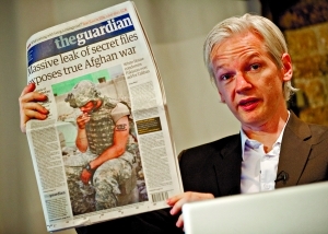 資料圖片:7月26日,倫敦,“維基解密”網(wǎng)站創(chuàng)始人朱利安·阿桑奇召開新聞發(fā)布會,他手拿一份《衛(wèi)報》,報上頭條就是此次“泄密事件”。